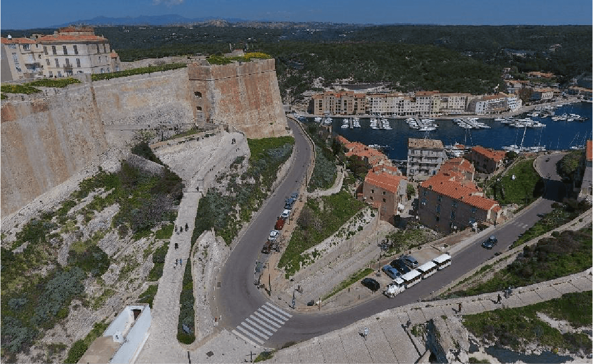 La route que le petit train emprunte pour accéder à la citadelle date du Second Empire, où Napoléon III a engagé de nombreux travaux d’aménagement en Corse en vue de développer son île d’origine. Elle amène à « la porte de France ». Avant sa construction la citadelle ne comportait qu’une entrée unique : « La porte de Gênes » dont l’accès se fait par la montée Saint-Roch (dite la grimpette), aux pieds du bastion.